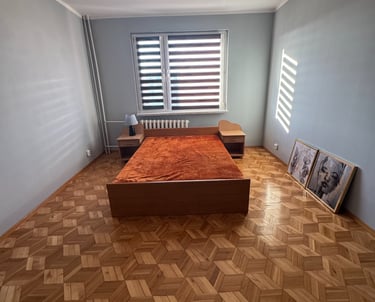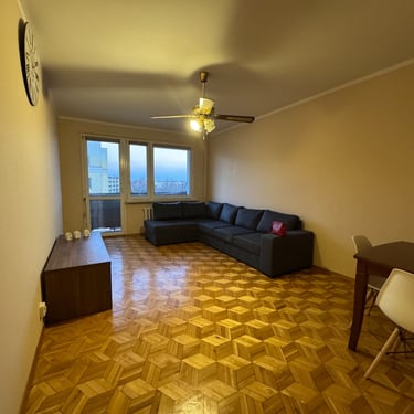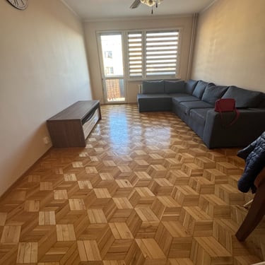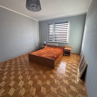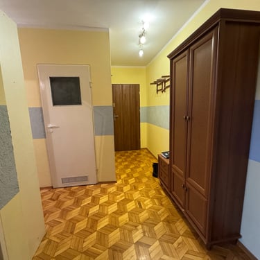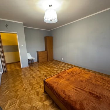 W środku znajdziesz dwa duże pokoje, w pełni umeblowaną i wyposażoną w sprzęt AGD kuchnię, łazienkę z osobnym WC oraz bardzo przestronny przedpokój z dużą szafą na odzież wierzchnią i dodatkową szafą na buty, czapki i szaliki. Mieszkanie jest częściowo umeblowane – w sypialni stoi łóżko, w salonie wygodny narożnik oraz stół z krzesłami.